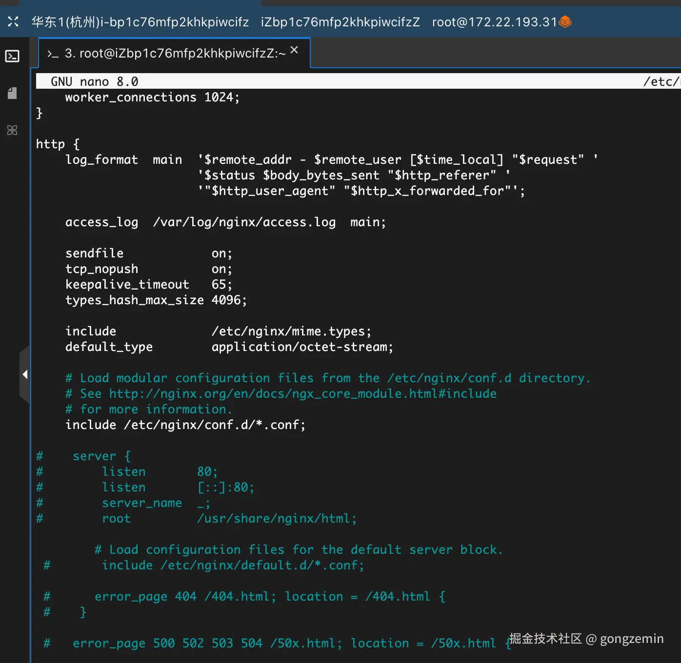 可以看到默认的nginx 80端口指向的是/usr/share/nginx/html,因为我们已经在yitong.conf里定义了80端口指向,http模块那里引入了我们定义的yitong.conf,我们把这部分注释掉,