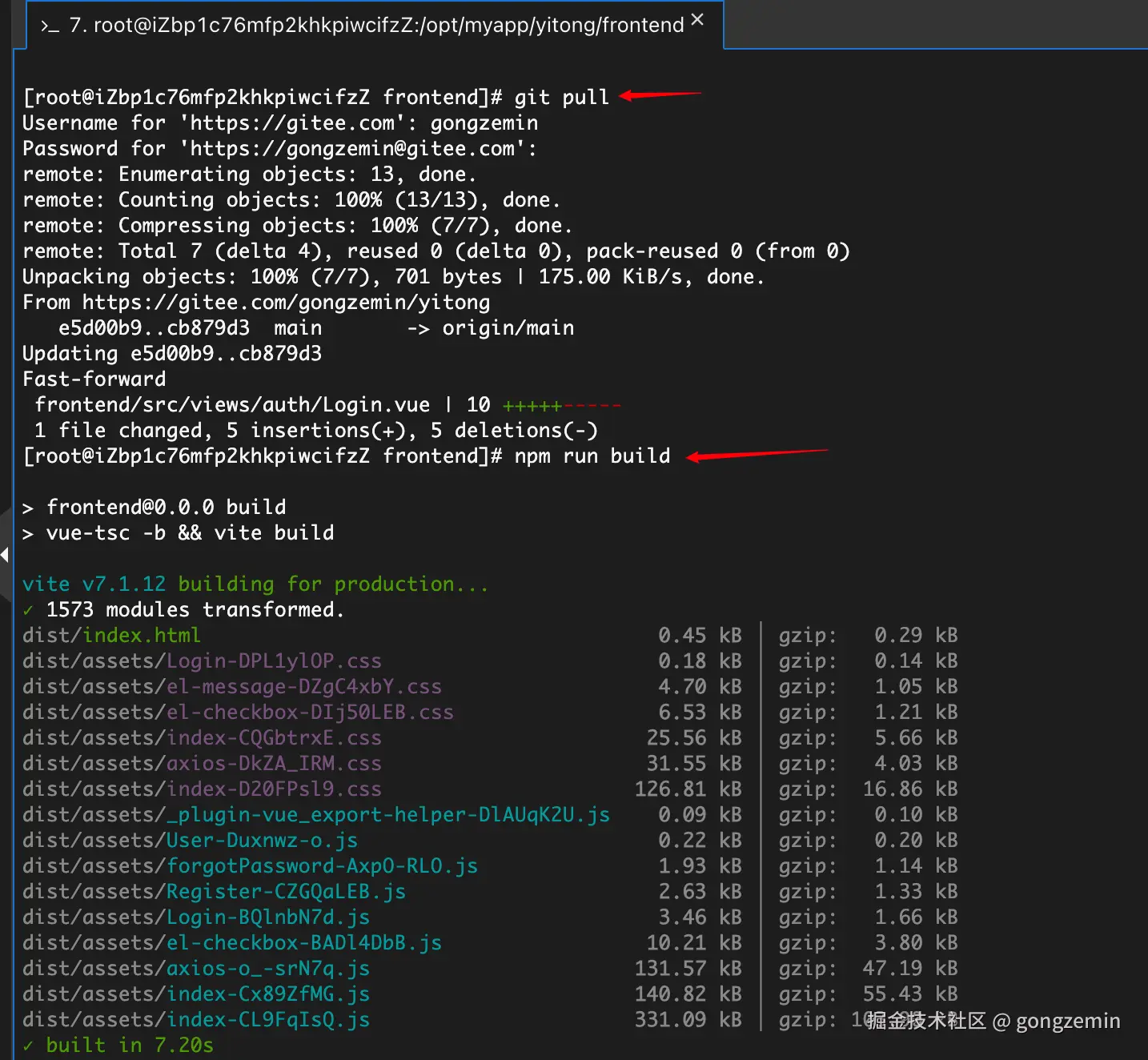 1. 进入到我们前端项目位置,拉取最新代码,安装依赖,打包