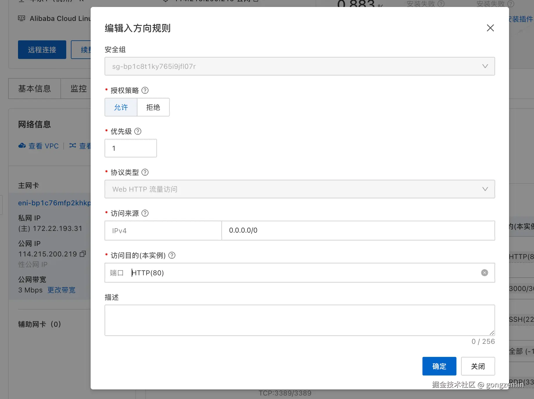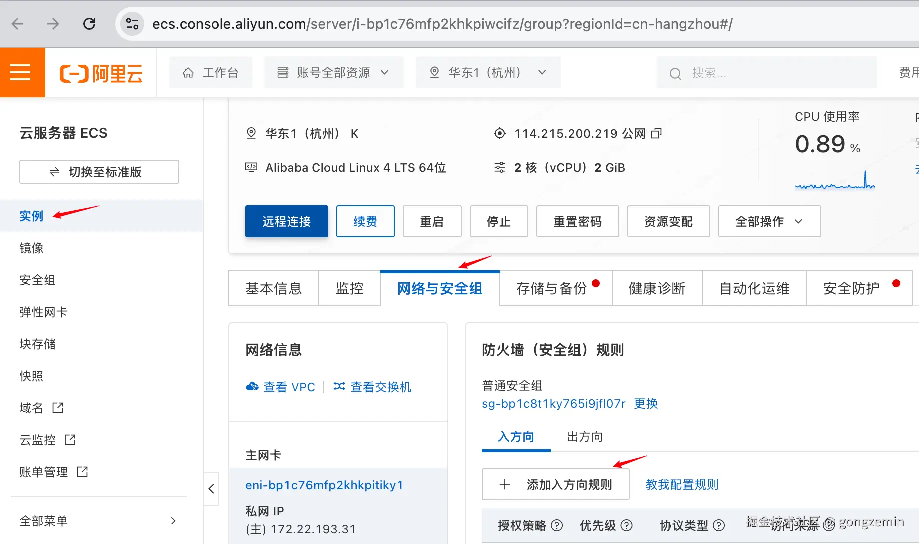 登录阿里云控制台,在我们的ECS示例里,在网络与安全组里,添加入方向规则