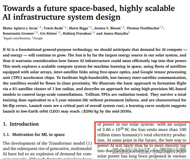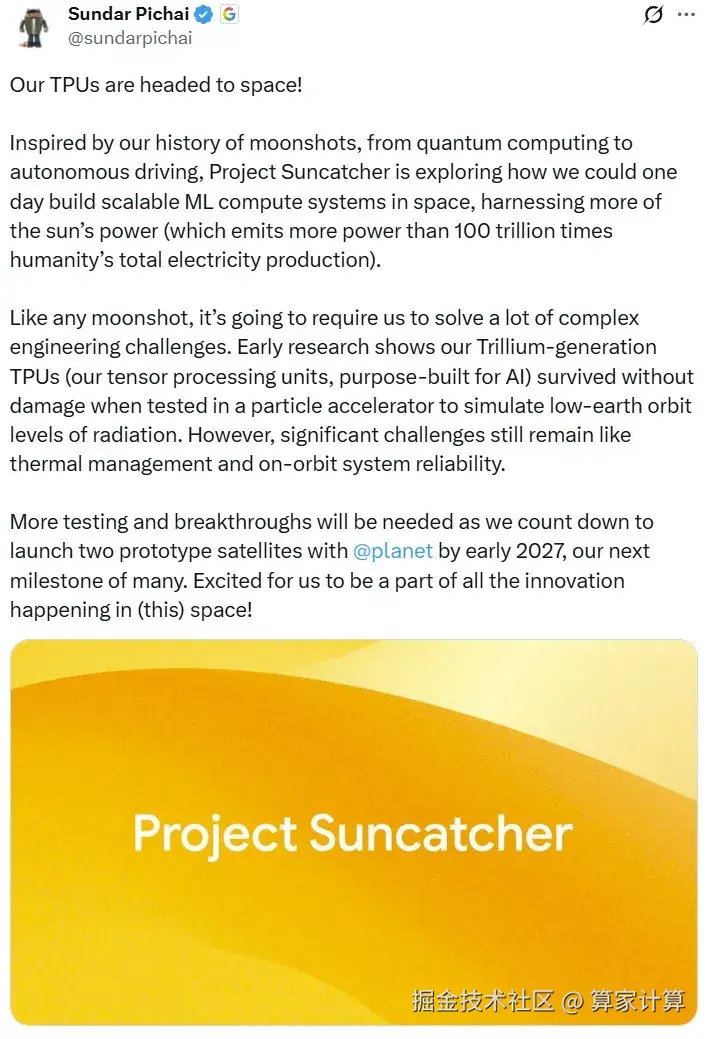 几乎同时,谷歌公布了"Project Suncatcher"计划,宣布将在2027年初发射两颗搭载TPU的原型卫星,该项目旨在利用太阳的能量来驱动 AI。谷歌CEO桑达尔·皮查伊坦言,这项计划如同任何登月项目一样,需要解决大量复杂的工程挑战。