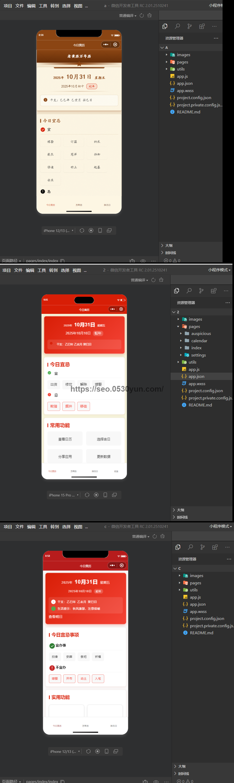 这个小程序是一个实用的传统日历工具,主要帮助用户查询和选择吉日良辰。它包含了三个核心功能: