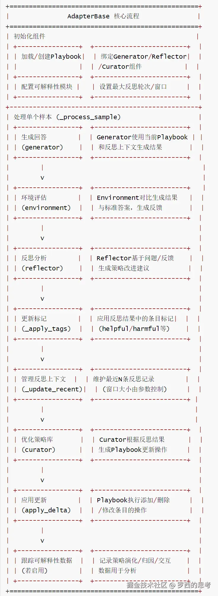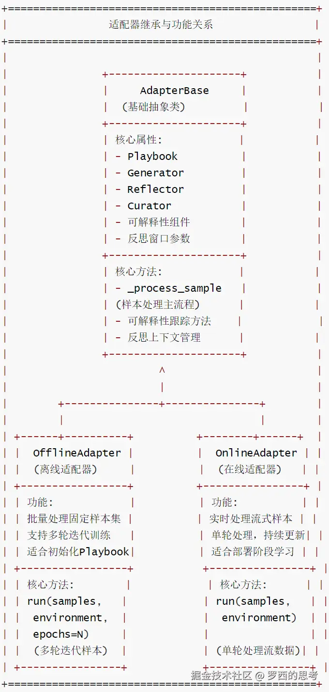 AdapterBase是基类,AdapterBase封装了通用逻辑,包括样本处理流程、可解释性数据跟踪、反思上下文管理等;核心方法是: