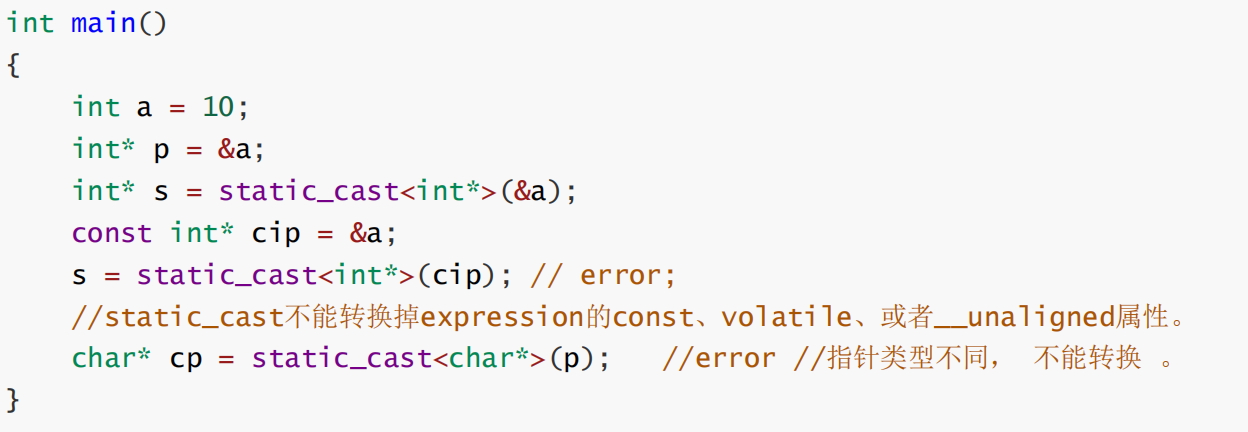 int* iptr = static_cast<int*>(ptr); // 将void*转换为int* 2.1//注意! 指针转换的限制 //不能去除掉const等特性 //具体指针类型不同不可以转换