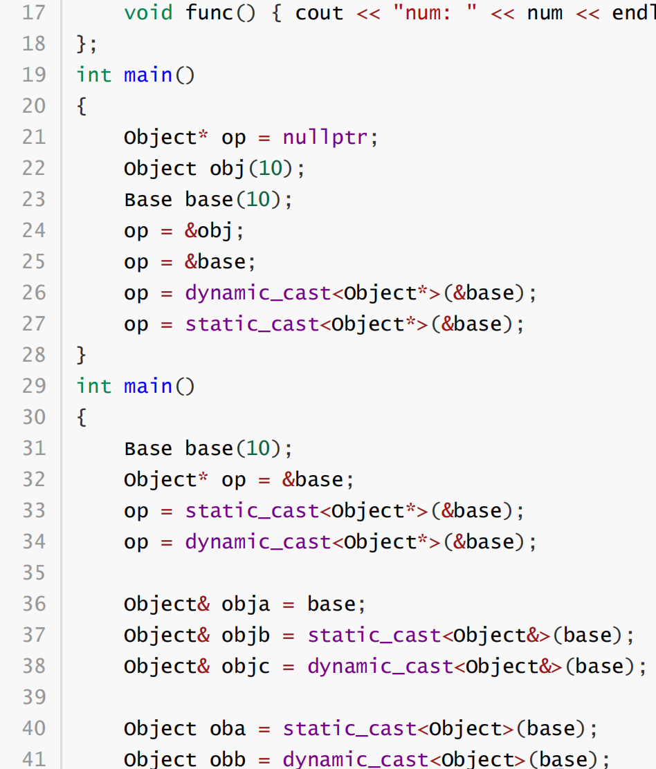 class Base { public: virtual ~Base() {} }; // 必须有虚函数 class Derived : public Base {}; Base* b1 = new Derived; // 实际指向Derived Base* b2 = new Base; // 实际指向Base Derived* d1 = dynamic_cast<Derived*>(b1); // 成功,d1指向有效的Derived对象 Derived* d2 = dynamic_cast<Derived*>(b2); // 失败,d2是nullptr if(d2) { // 安全的做法:检查返回值 // ... 使用d2 } else { std::cout << "转换失败!" << std::endl; } -