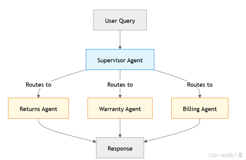 一个中央协调器( supervisor )会根据查询类型将请求路由到专门的智能体。每个专门的智能体都有自己针对特定领域优化的系统提示词。