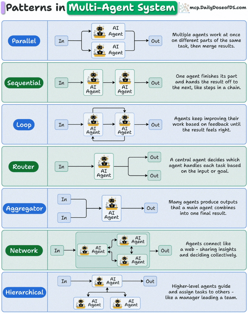 此可视化说明了多代理编排的7种核心模式,每种模式都适用于特定的工作流: