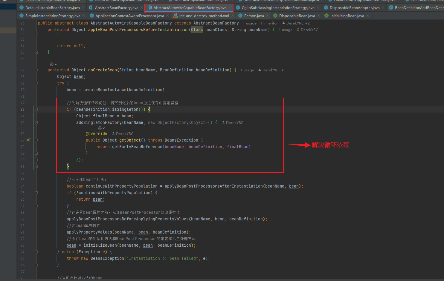 详情请见这篇文章:spring中解决循环依赖的核心代码之一:将实例化后的bean放进缓存中提前暴露
