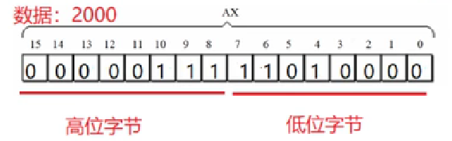 一个寄存器可以存储一个字数据,例如数据2000 D,其二进制数值为:0000 0111 1101 0000,存储格式如下: