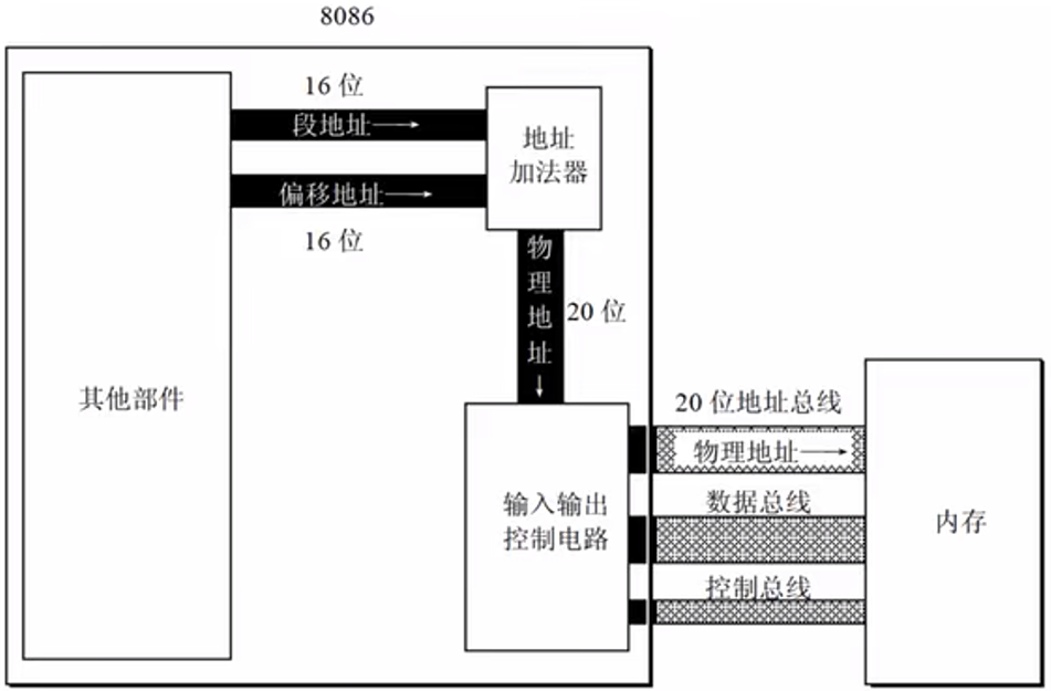 也就是说,8086CPU内部一次性能处理的数据长度最大为16位。它的地址总线是20位,在内部有一个地址加法器可以将两个16位地址合成一个20位的物理地址,示意图如下: