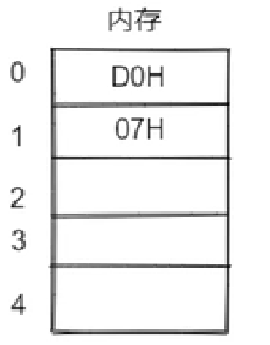内存单元是字节单元,也就是说一个字节单元对应一个内存单元,当我们要保存一个字数据时,应该用两个地址连续的内存单元来保存。数据的低字节存放在低地址单元中,高字节存放在高地址单元中,假设我们从0地址开始存放2000 D(对应16进制 07D0 H),其中07是高字节,D0是低字节,内存单元是以16进制来体现的。如下所示:
