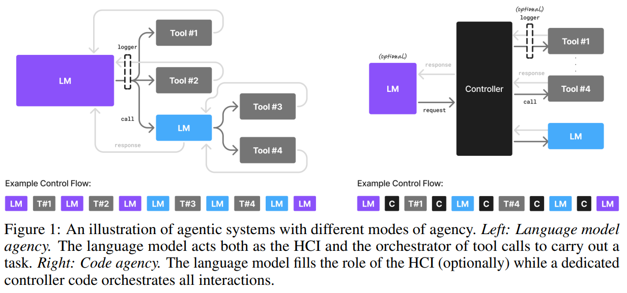 Figure 1: An illustration of agentic systems with different modes of agency. Left: Language model agency. The language model acts both as the HCI and the orchestrator of tool calls to carry out a task. Right: Code agency. The language model fills the role of the HCI (optionally) while a dedicated controller code orchestrates all interactions.图 1:具有不同代理模式的代理系统示例。左:语言模型代理。语言模型同时充当人机交互界面(HCI)和工具调用的协调者以完成任务。右:代码代理。语言模型可选地充当人机交互界面(HCI),而专用的控制器代码协调所有交互。