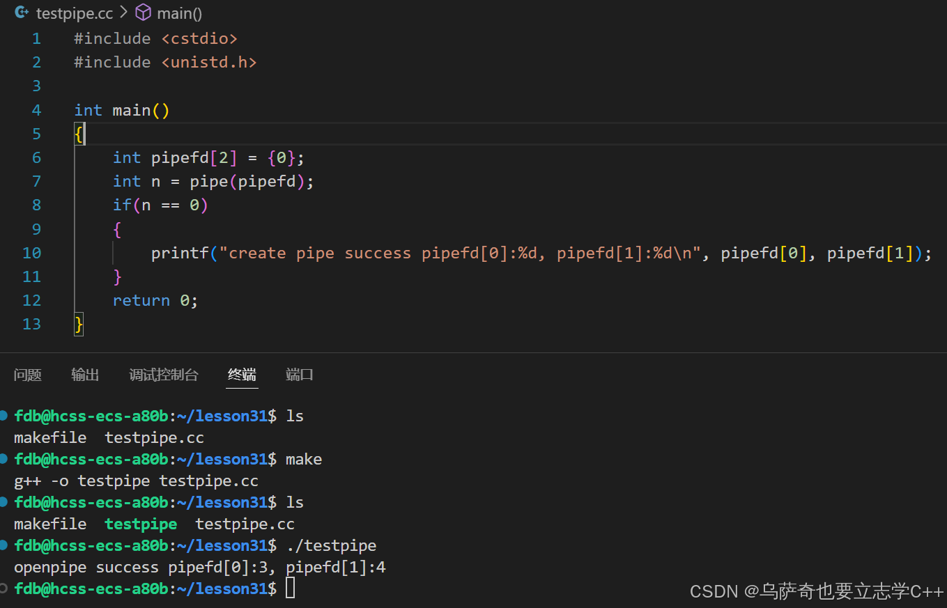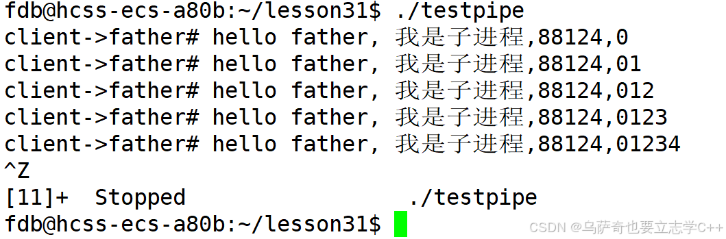 下面我们来尝试父子进程之间进行通信,代码示例是子进程读,父进程写。