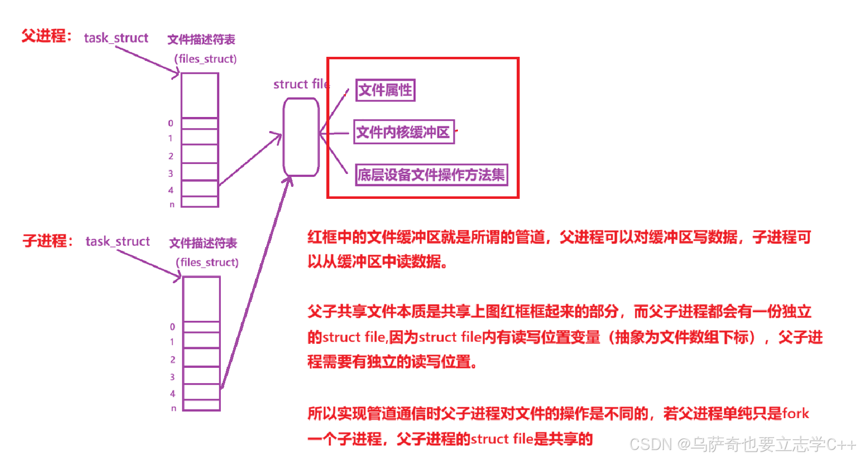 一般父子进程和文件行为和父子进程管道通信时的文件行为的本质区别就是struct file是否共享。