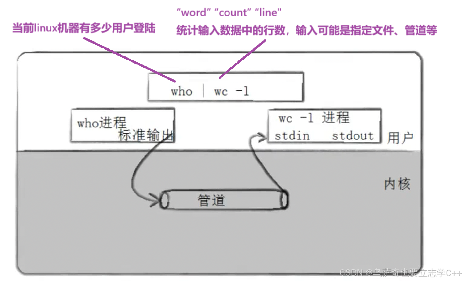 (who和wc都是bash的子进程,具有血缘关系,所以这里的管道是匿名管道)