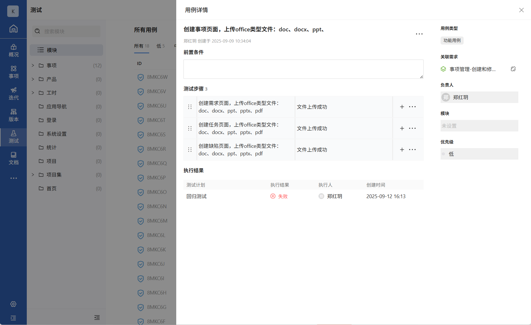 如果在执行测试用例的过程中发现了相关缺陷,可以点击用例详情->关联缺陷,快速提交并关联缺陷。