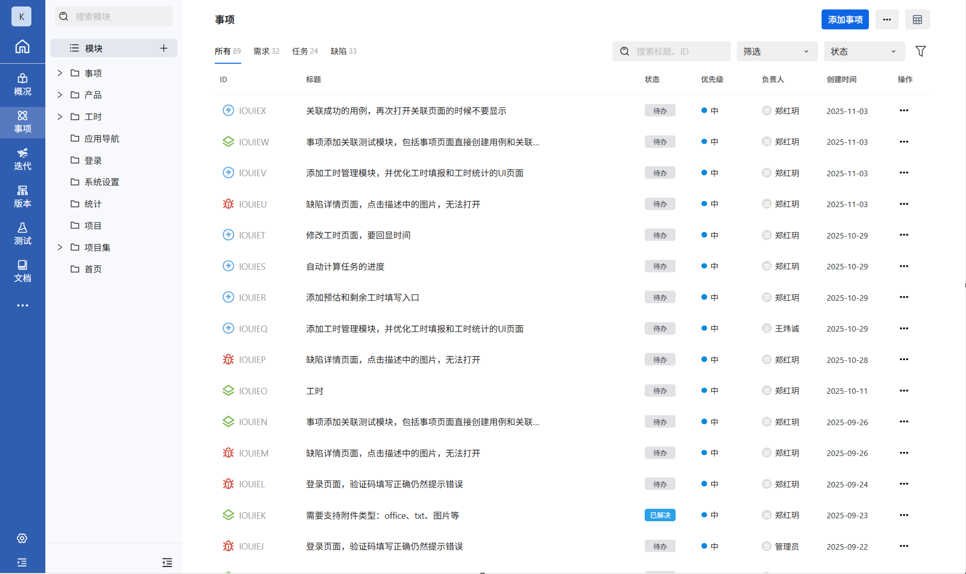 进入项目->事项,点击事业页面左侧导航栏中所有模块后的"+",可以为当前项目添加功能模块。添加测试用例时可以选择模块。