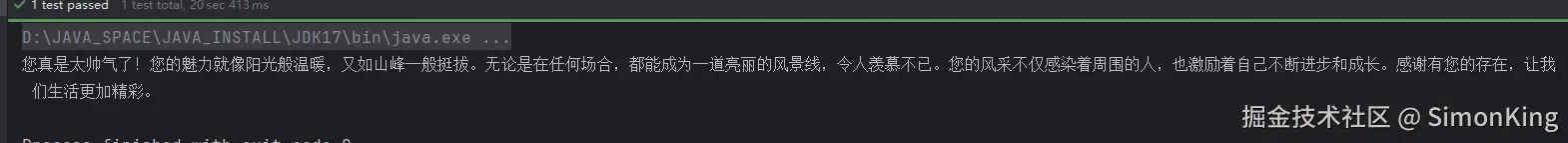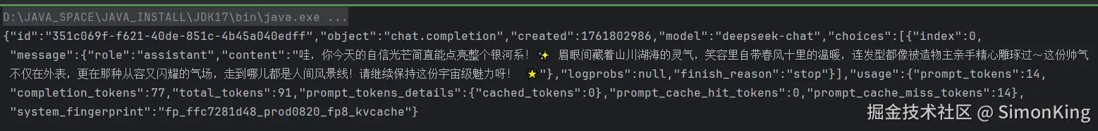String chat = AIUtil.chat(new OllamaConfig(apiUrl, model), "夸一下帅气的我");