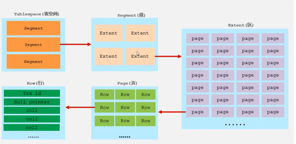 段,分为数据段(Leaf node segment)、索引段(Non-leaf node segment)、回滚段(Rollback segment),InnoDB是索引组织表、数据段就是B+树的叶子节点,索引段即为B+树的非叶子节点。段是用来管理多个Extent(区)。