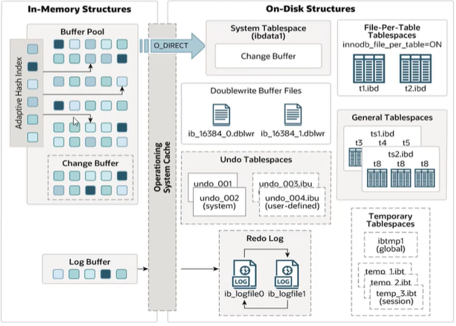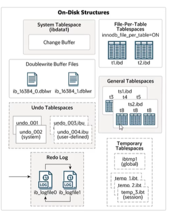 Temporary Tablespaces:InnoDB使用会话临时表空间和全局临时表空间,存储用户创建的临时表等数据。