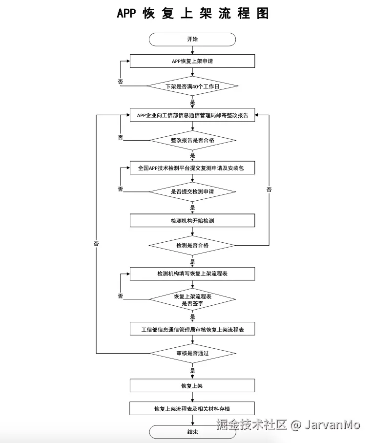 另外,根据我查到的资料,APP侵害用户权益的检测工作是全国APP技术检测平台(APP公共服务系统)做的,并且提供了一套APP侵害用户权益专项整治行动恢复上架流程,我贴个图如下: