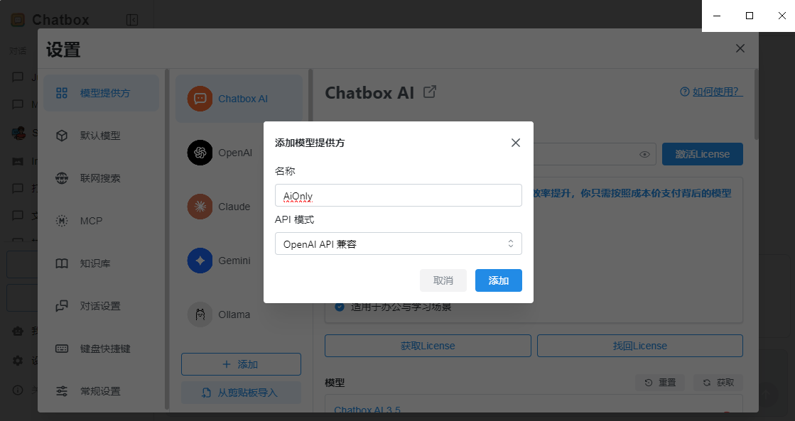 第三步:名称填AiOnly,API模式选择OpenAI API兼容,配置完成后点击添加