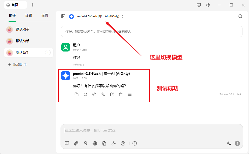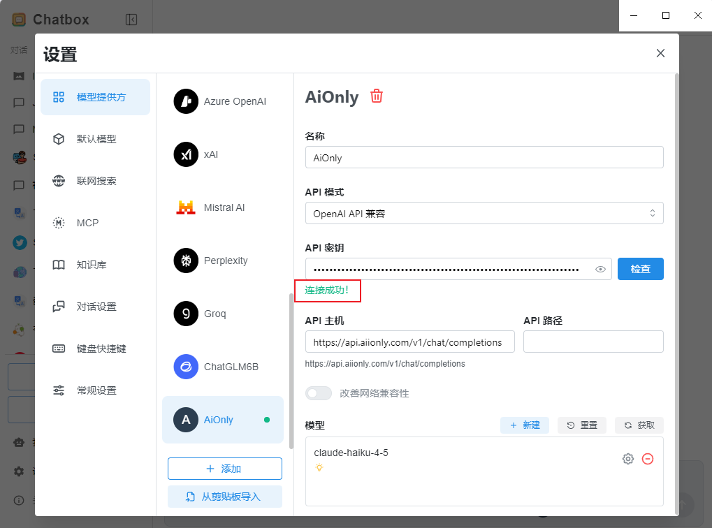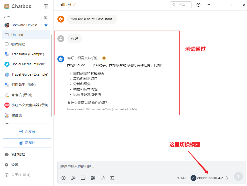 第七步:创建一个新对话,使用AiOnly的Claude Haiku 4.5模型,如下图所示已经测试成功