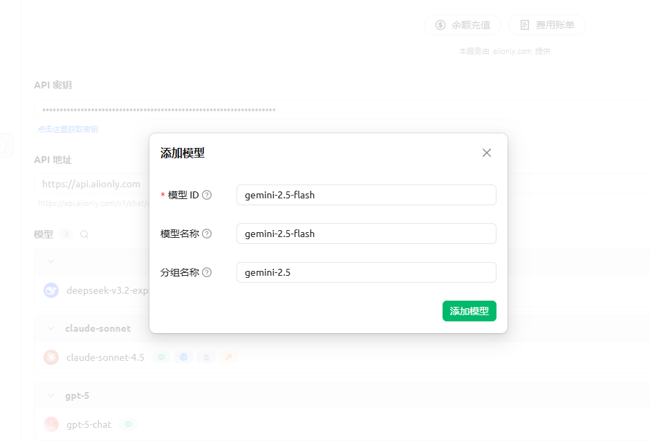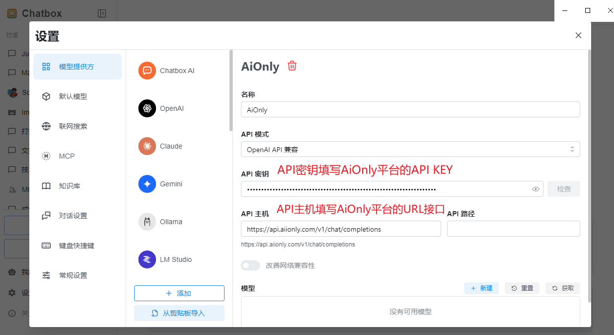 API密钥填写AiOnly平台的API KEY,API主机填写AiOnly平台的URL接口(固定的:https://api.aiionly.com/v1/chat/completions)