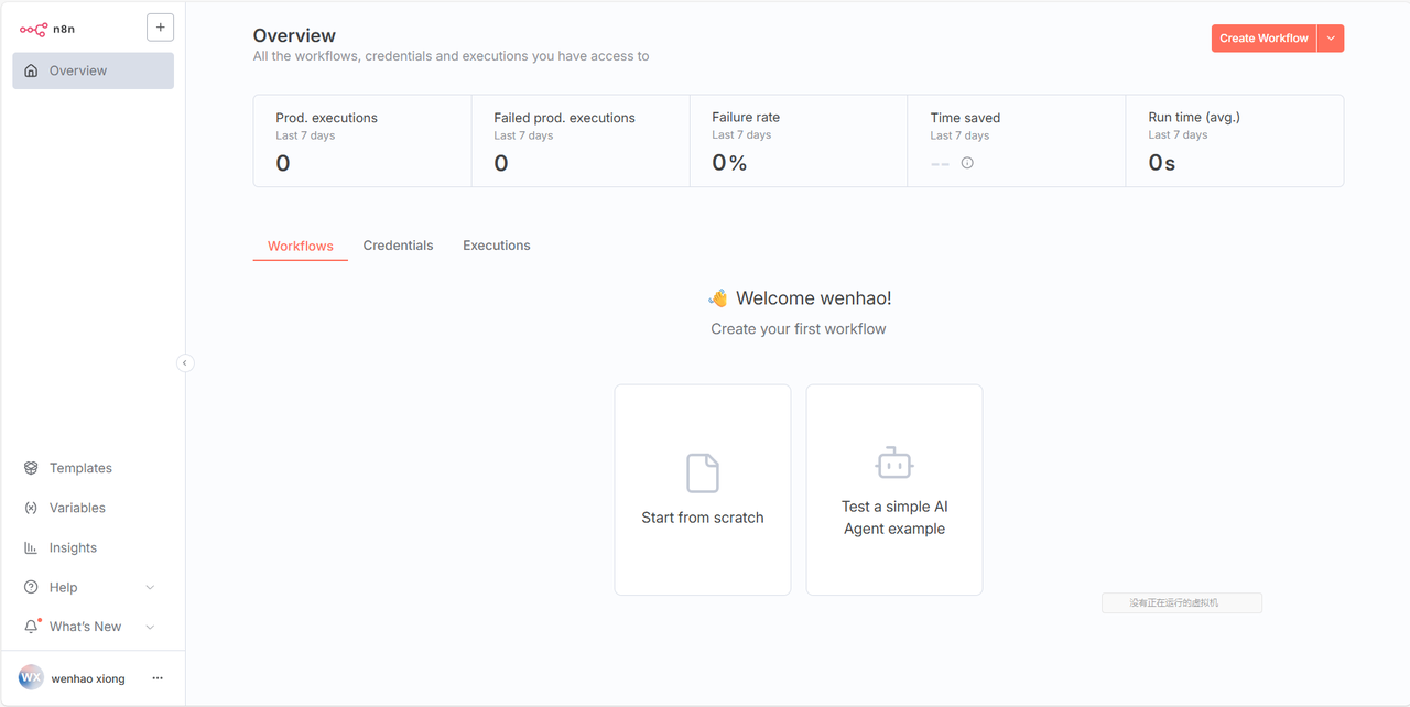 登录后进入到n8n的主页面。至此,我们已经成功部署n8n了。