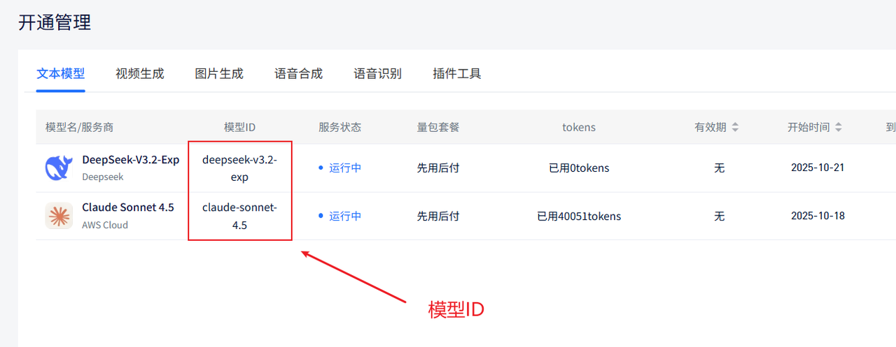 在开通管理中也能找到模型ID,后续我们要使用哪个模型就需要指定哪个模型的ID,也是相当重要的
