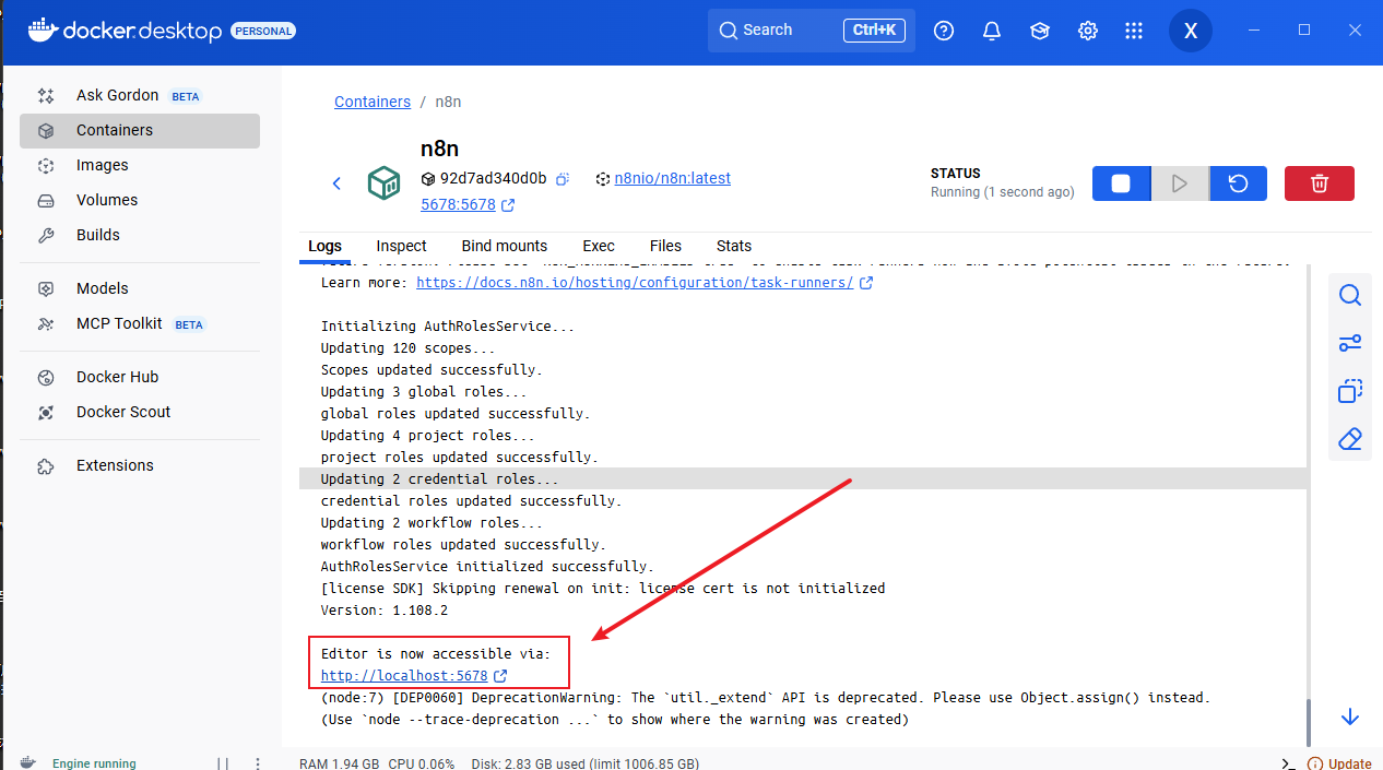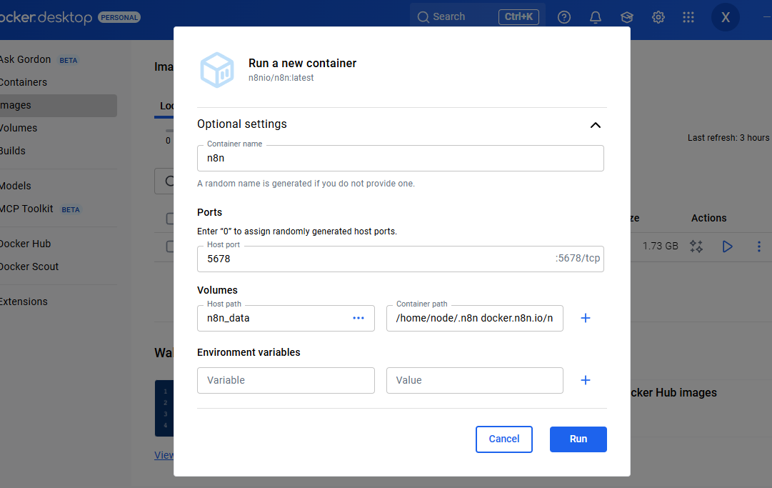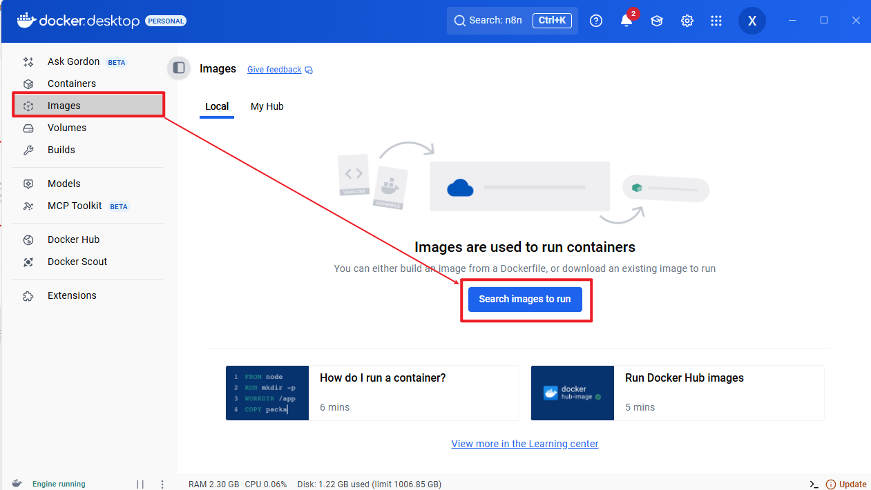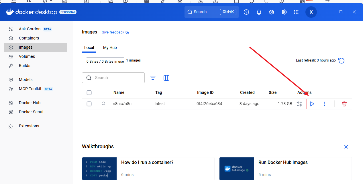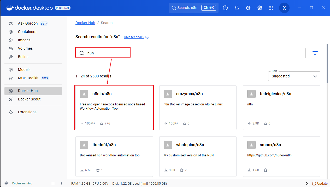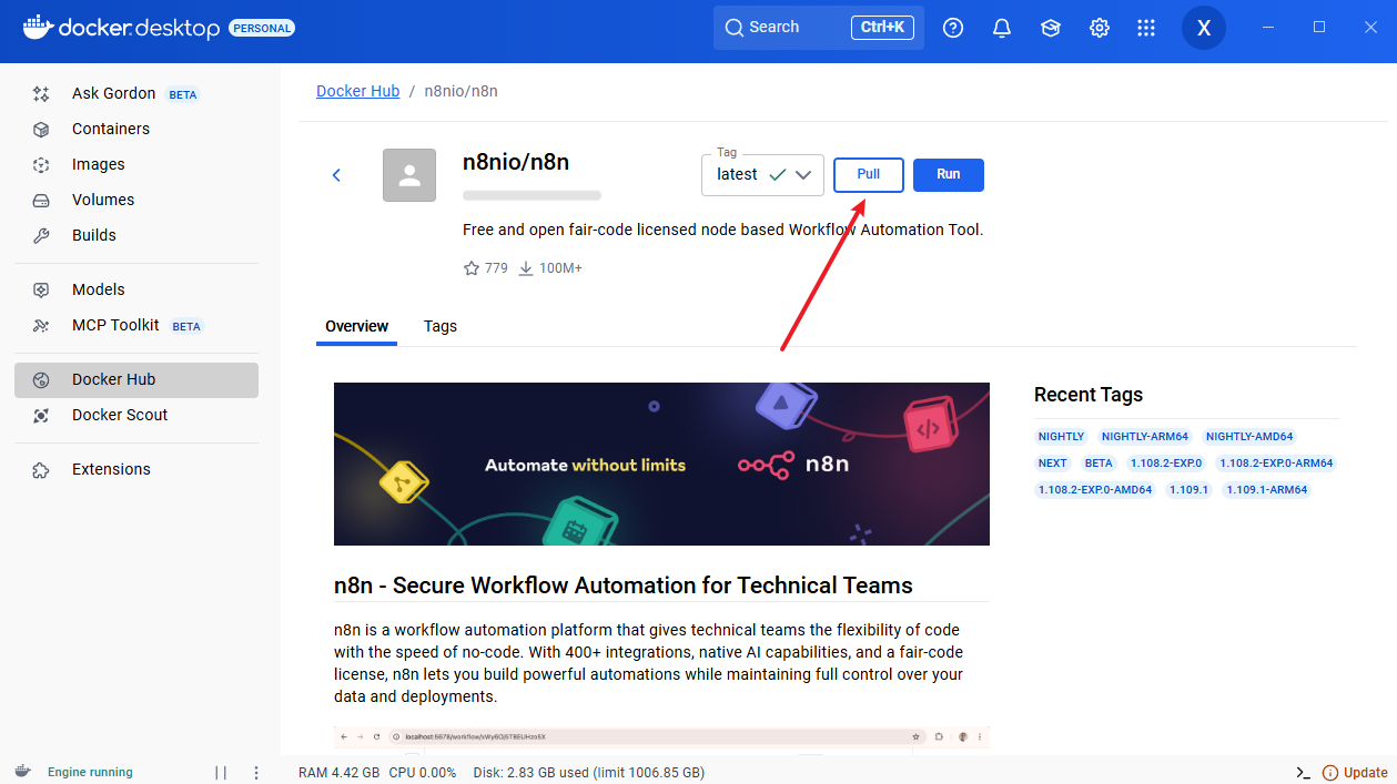 在Docker Hub中搜索n8n,然后找到n8nio/n8n点击Pull
