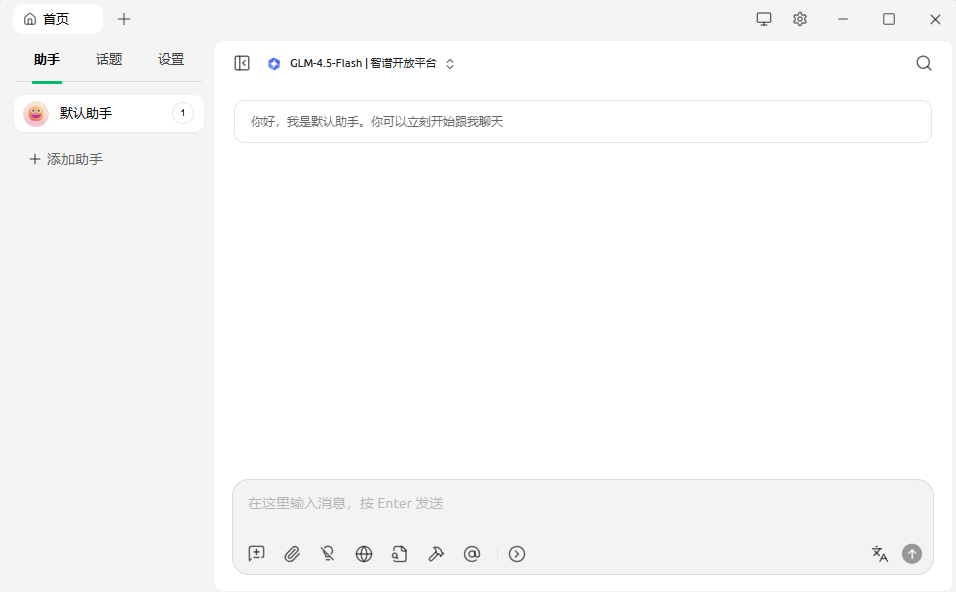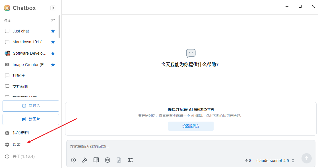启动后进入首页,首页提示我们需要配置AI模型提供方才能使用,那么让我们一起来接入AiOnly
