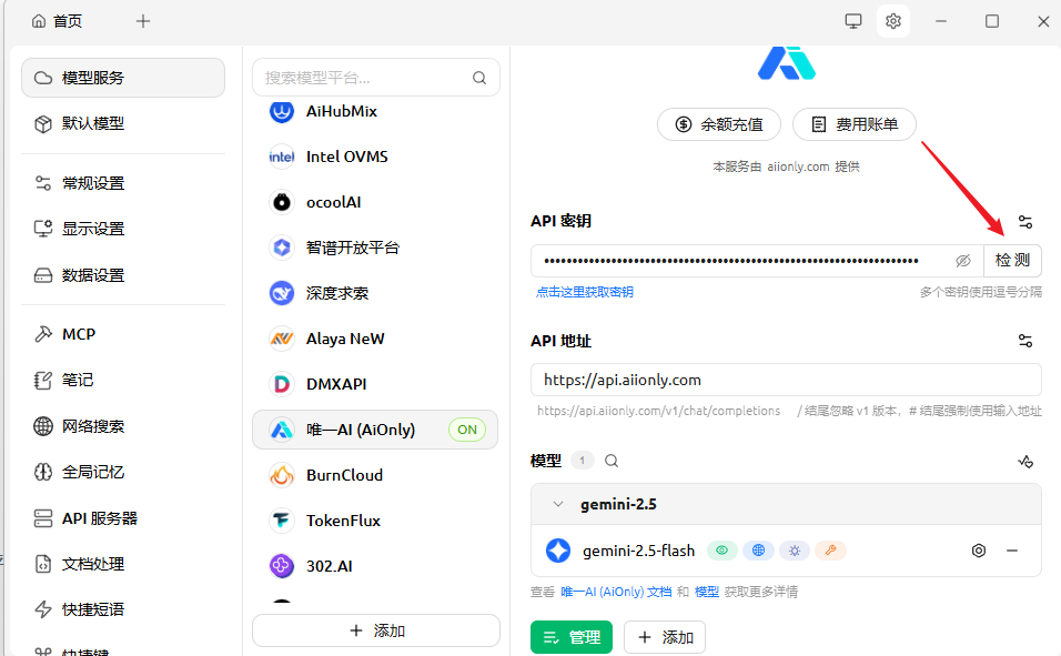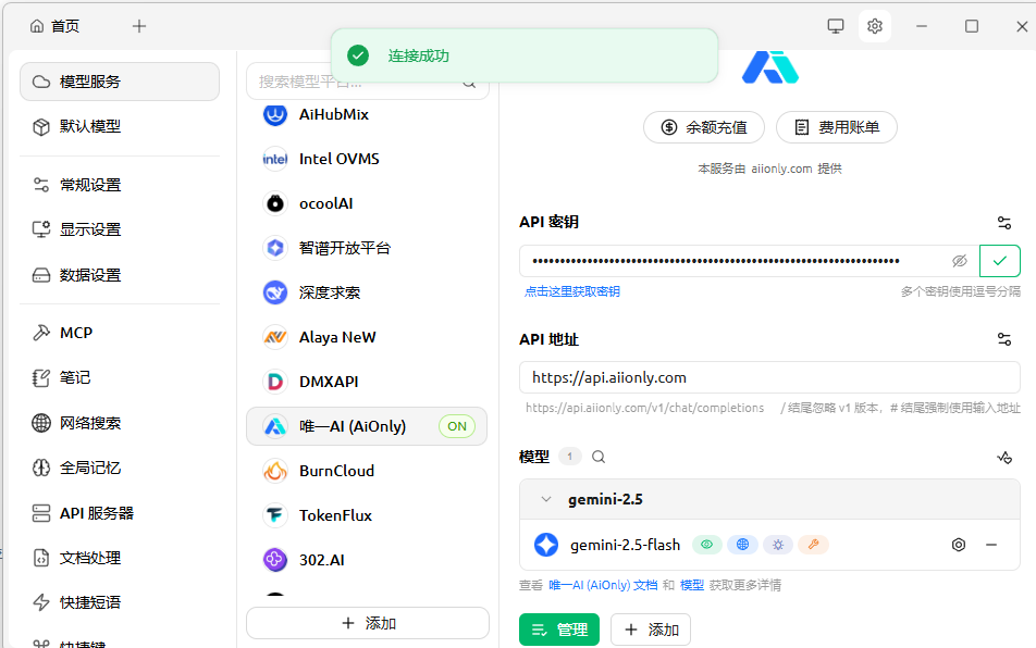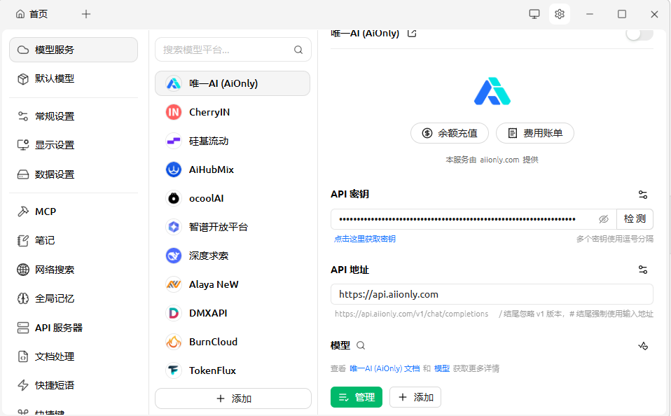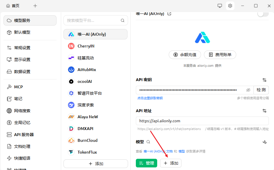 第二步:在模型服务中找到唯一AI(AiOnly),配置API密钥和API地址,在Cherry Stidio中API地址只需要配置域名即可:https://api.alionly.com