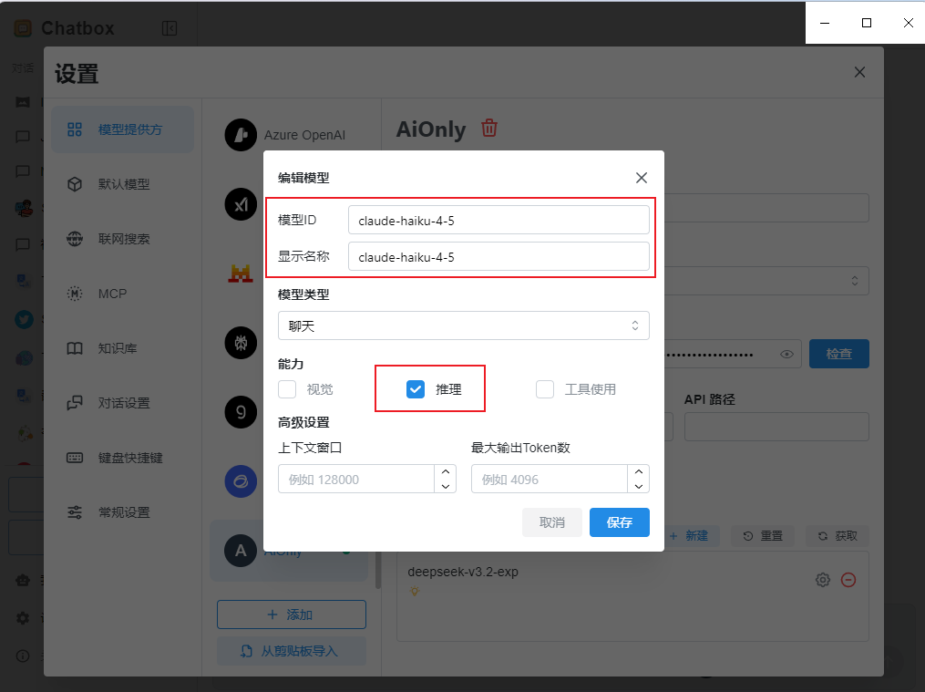 能力选项勾选推理 ,根据自己的业务需求来配置上下文窗口 以及最大输出的Token数。配置完毕后点击保存。