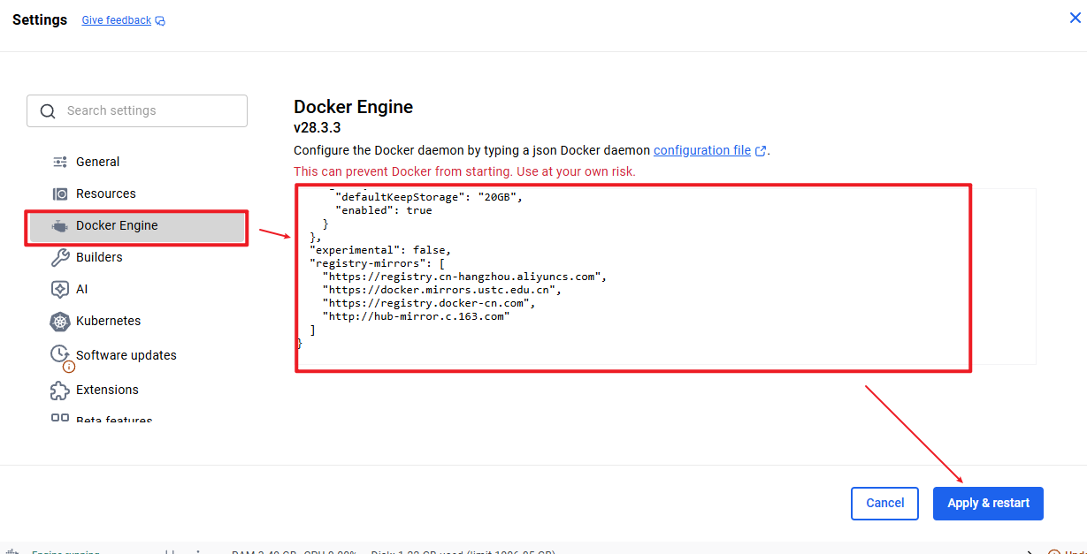 需要配置Docker的国内镜像源,在Settings中配置Docker Engine,配置完毕后点击Apply&restart应用并重启: