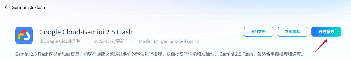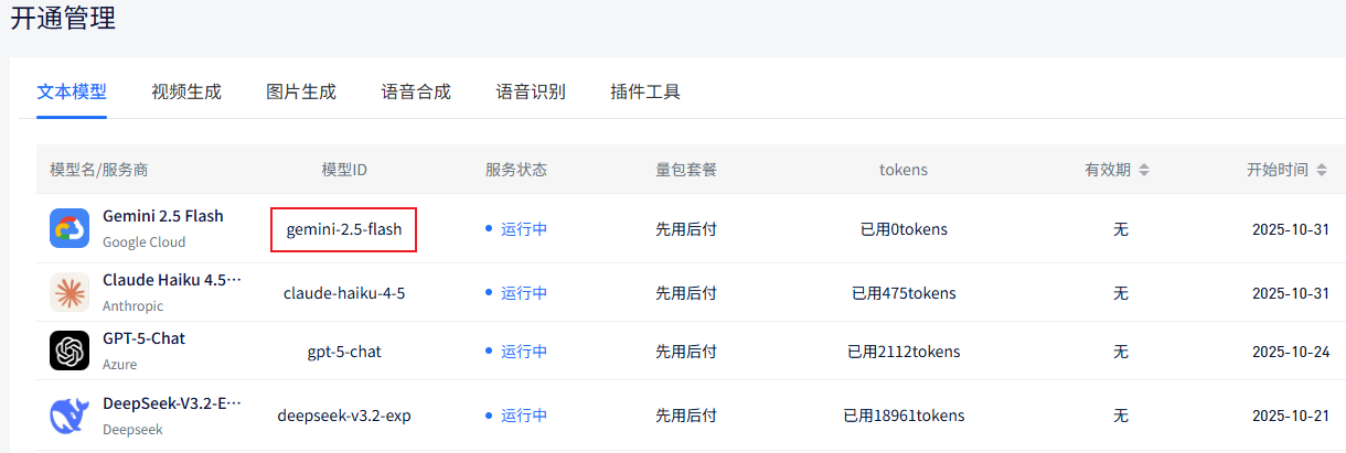 开通完成后,可以到开通管理中找到模型ID:gemini-2.5-flash