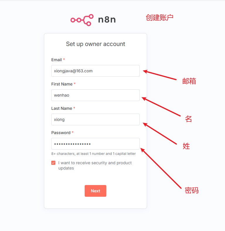 在浏览器中访问http://localhost:5678进入n8n创建账户页面