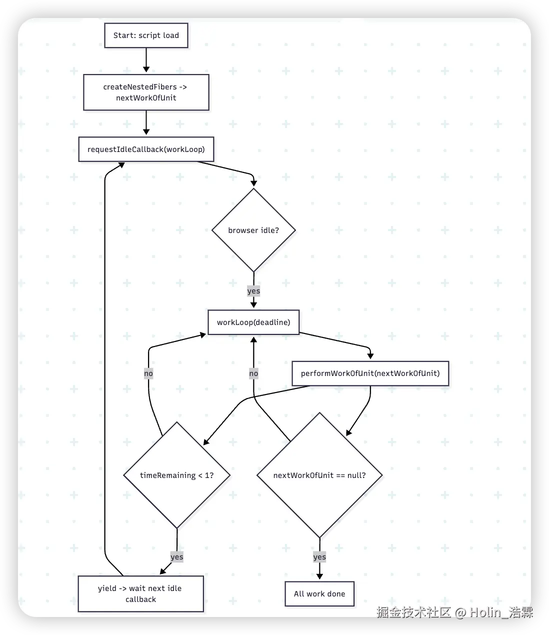 workLoop(deadline),每次处理一个或多个performWorkOfUnit,时间不够时保存nextWorkOfUnit并等待下一次空闲回调。
