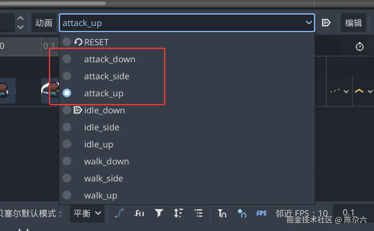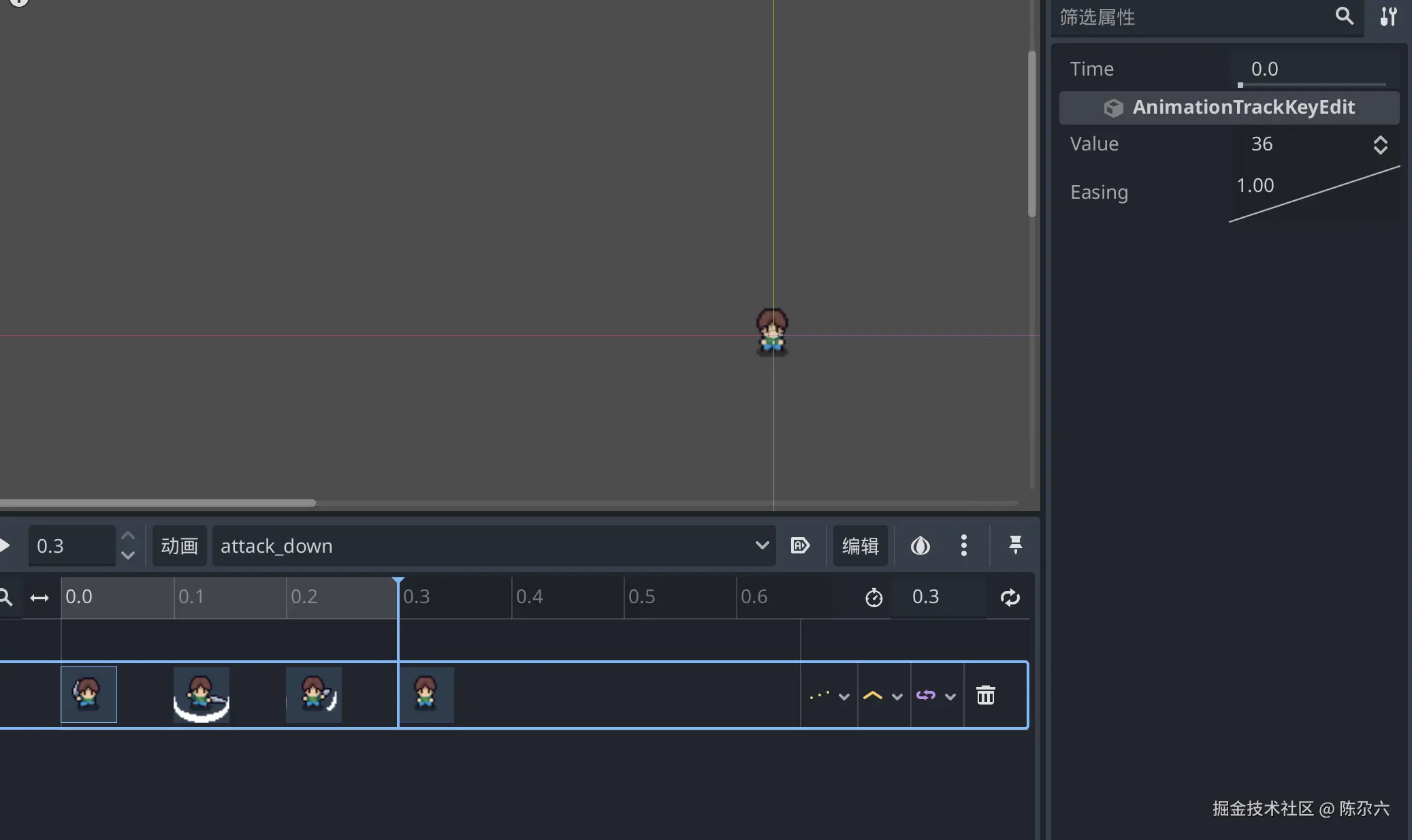 所以我们创建一个attack_down动画,从第36帧开始,每0.1秒切换一帧,持续0.3秒;这样我们就完成一个向下的攻击动画。