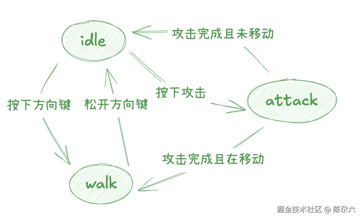上一节中我们实现了角色待机和行走的动画,并且配合键盘输入的监听,让角色能在两个动画间切换。本节我们将继续完善角色功能,实现攻击系统,并引入有限状态机这个重要的设计模式来优化我们的代码结构。