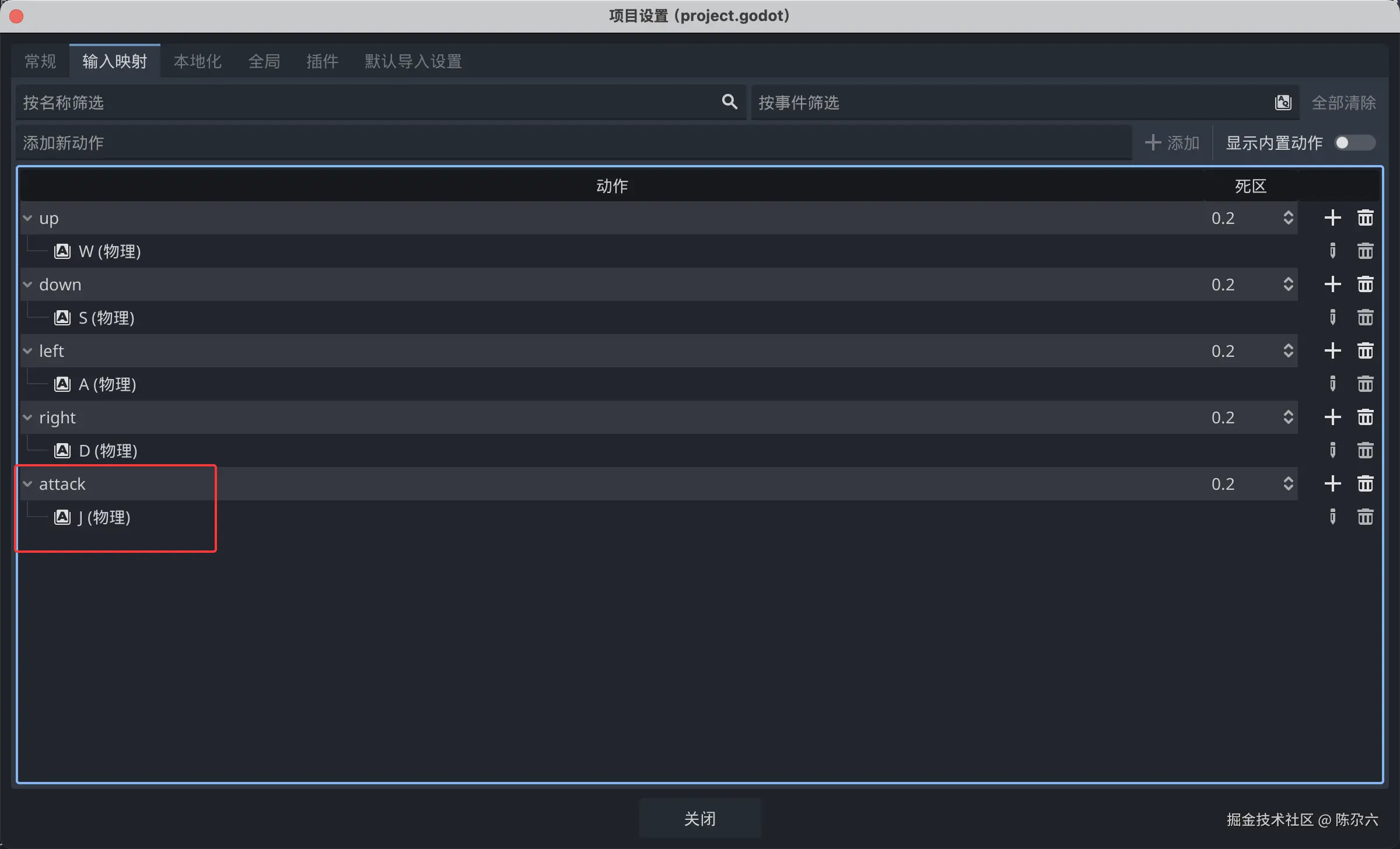 在开始编写脚本之前,我们需要先配置输入映射。进入项目 → 项目设置 → 输入映射,添加一个名为attack的输入动作,并绑定到J键。