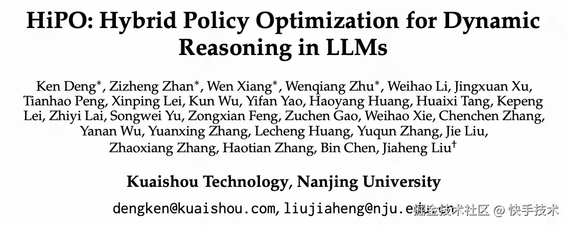 如今,快手 KwaiKAT 团队与南京大学刘佳恒老师 NLINK,张煜群教授实验室 ARiSE 合作重磅推出HiPO(Hybrid Policy Optimization)框架,为LLM装上了智能的"思考开关"。该框架通过创新的混合数据冷启动与混合强化学习奖励系统,使模型能够自主、动态地决策何时该启动详细推理(Think-on),何时该直接给出答案(Think-off)。