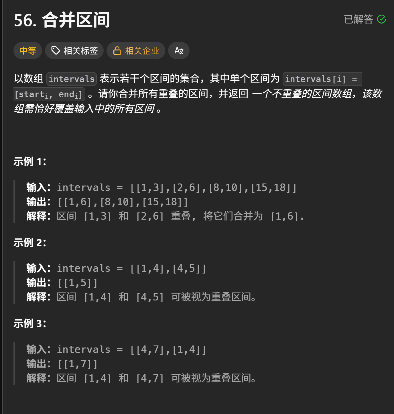 先按左边界排序,然后开始遍历。发现有当前位置区间和前一位置区间有交集,就合并区间并存放在当前位置,这样可以方便之后遍历的下一位置i+1与当前位置i对比看是否有交集。若无交集则将当前位置i存放的区间放到res中。