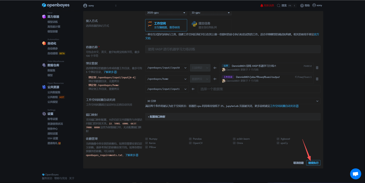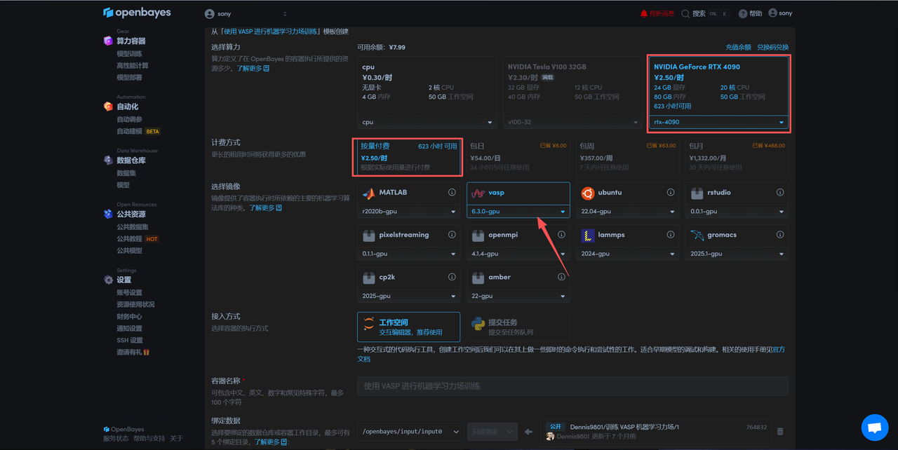 选择「NVIDIA GeForce RTX 4090」以及「vasp」镜像,OpenBayes 平台提供了 4 种计费方式,大家可以按照需求选择「按量付费」或「包日/周/月」,点击「继续执行」。可以使用文章开头的邀请链接,获得 RTX 4090 使用时长!