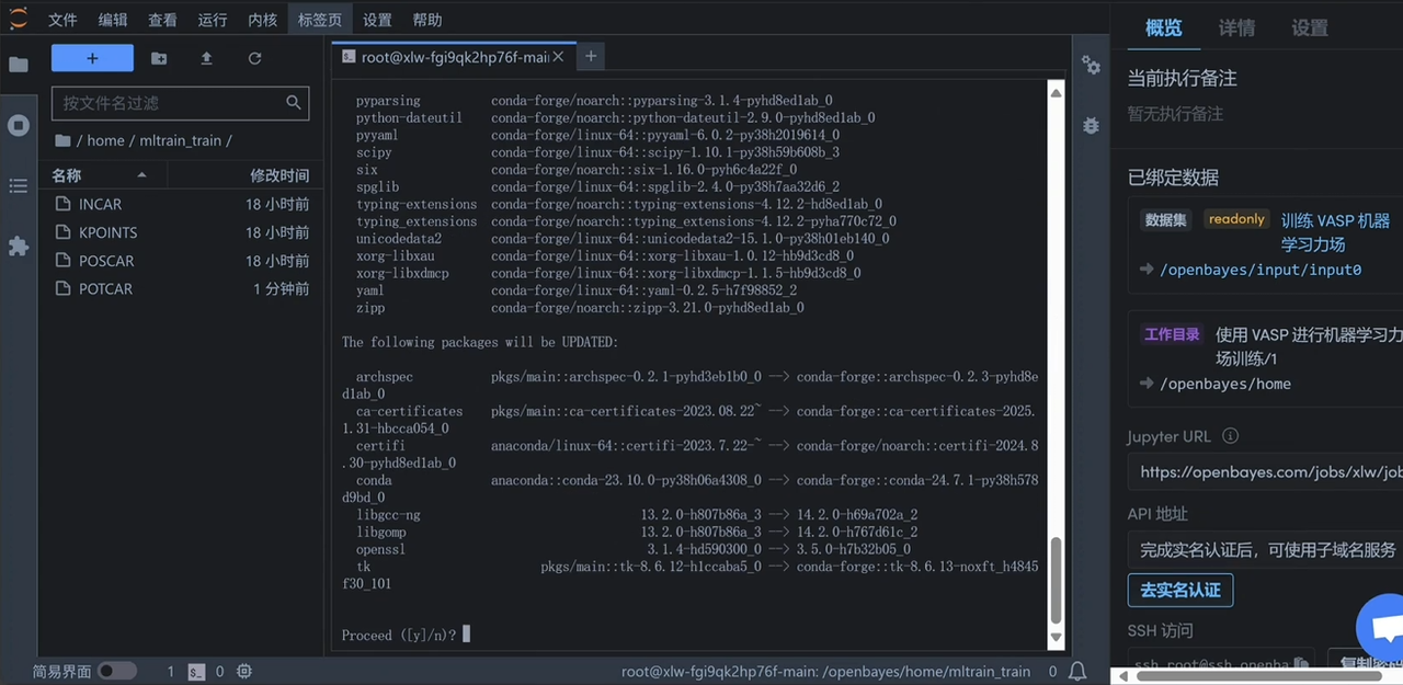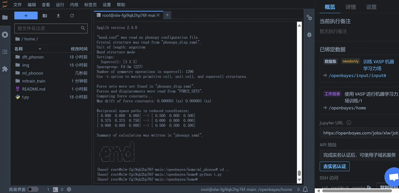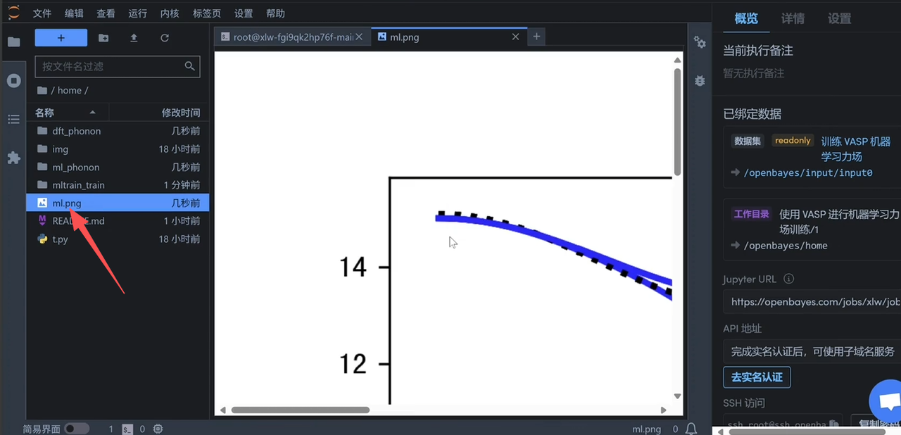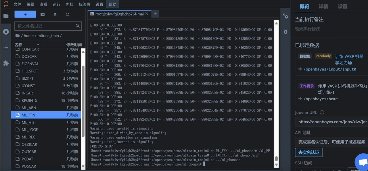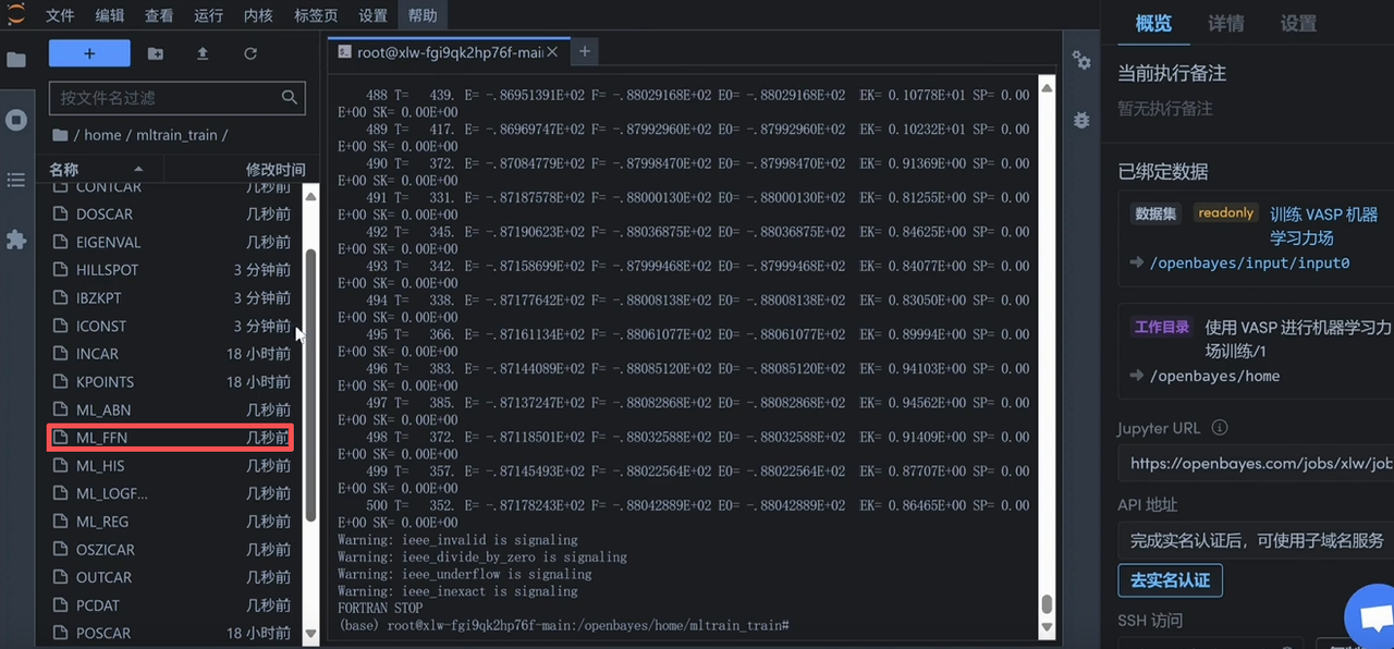 运行以下命令直接运行 vasp,运行完毕后左侧会出现训练好的机器学习力场文件「ML_FFN」。