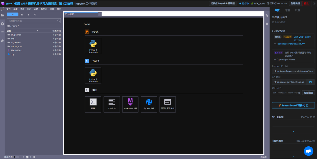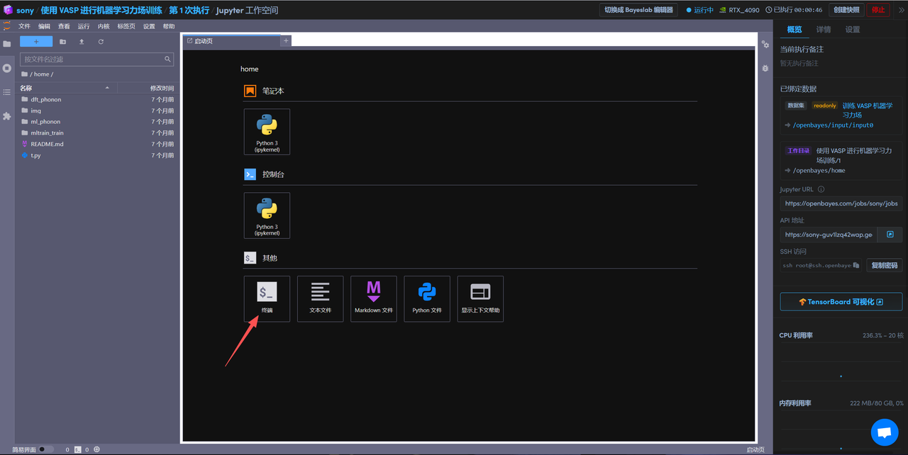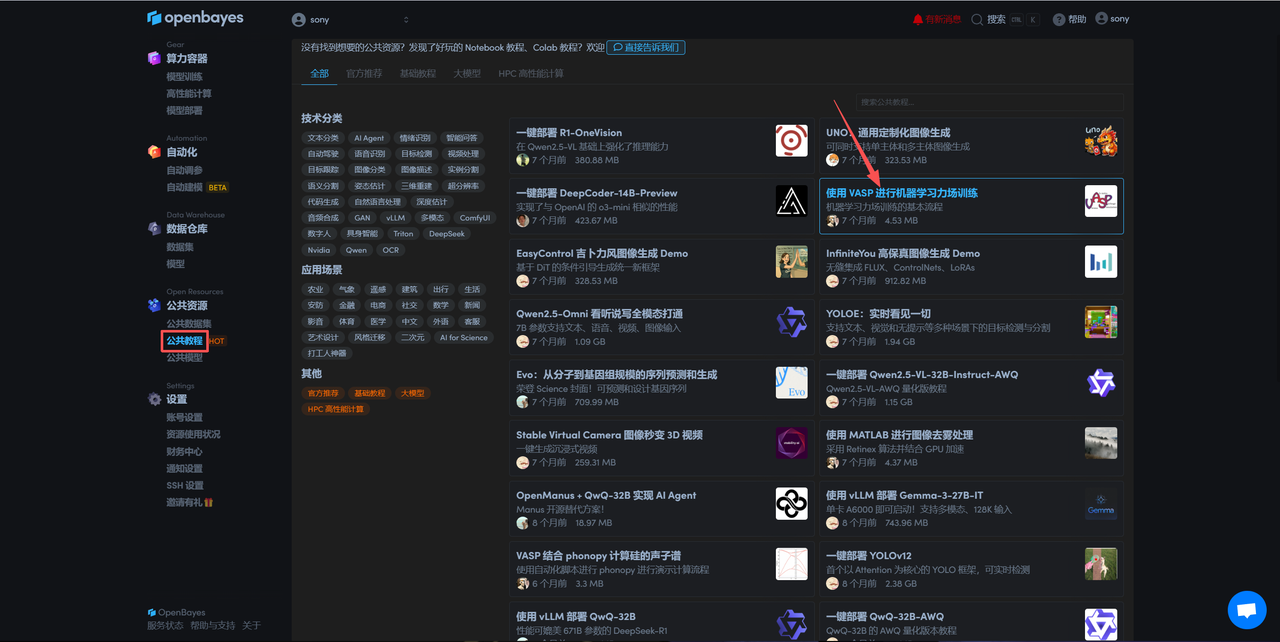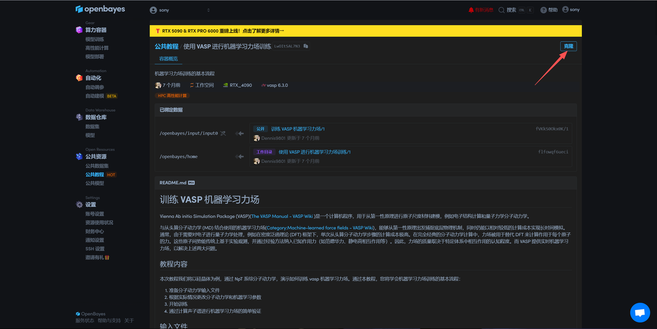 登录 OpenBayes.com,在「公共教程」页面,选择「使用 VASP 进行机器学习力场训练」教程。