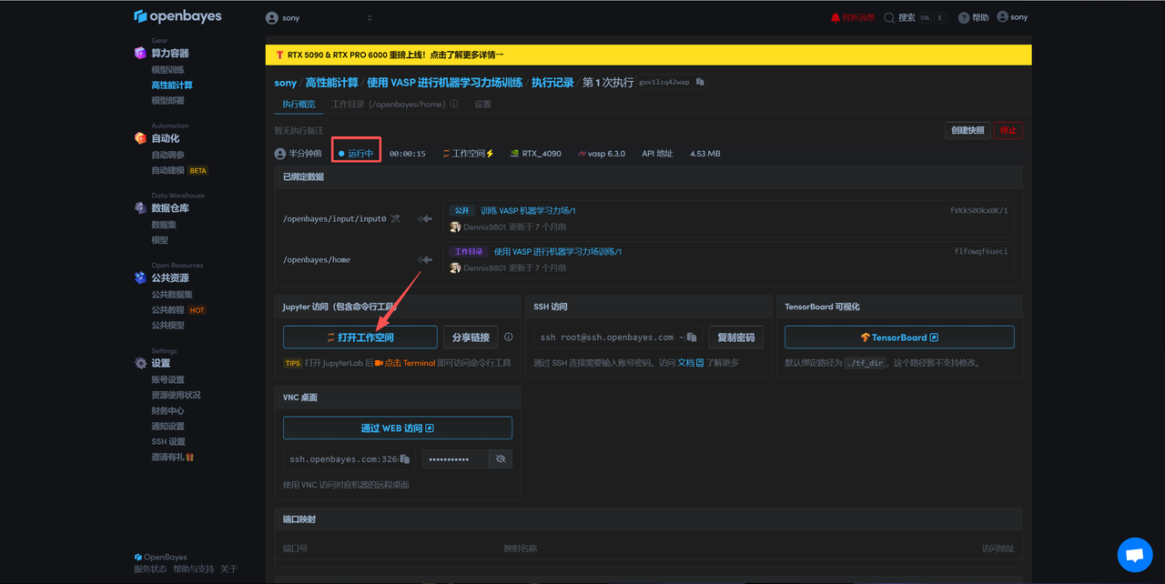 待系统分配好资源,当状态变为「运行中」后,点击「打开工作空间」。