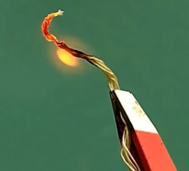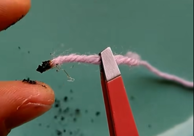 - 羊毛 不太能烧起来,会收缩生成黑灰,灰能捏碎,有烧羽毛的味道。