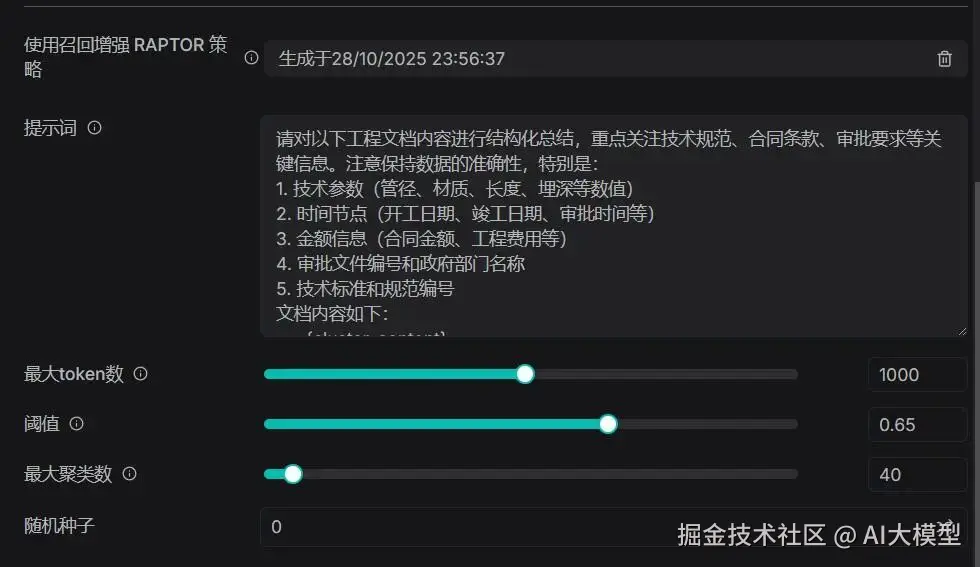 RAPTOR的核心参数直接决定"知识树"的结构与质量,结合工程文档(规范、标书、检测报告等)的层级性、技术性特点,逐一拆解含义及适配方案: