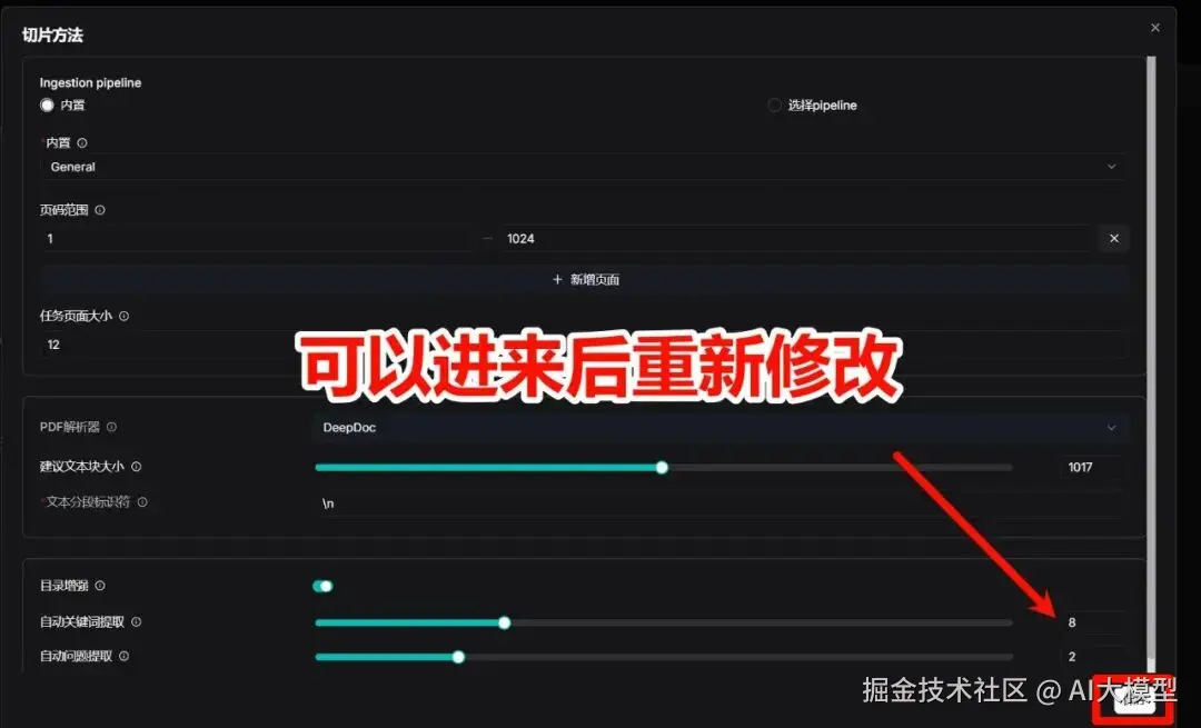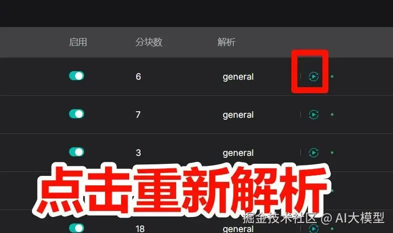 我喜欢把"创建时解析"打开,上传完文档就自动解析分块、弄关键词、给块提问题等。