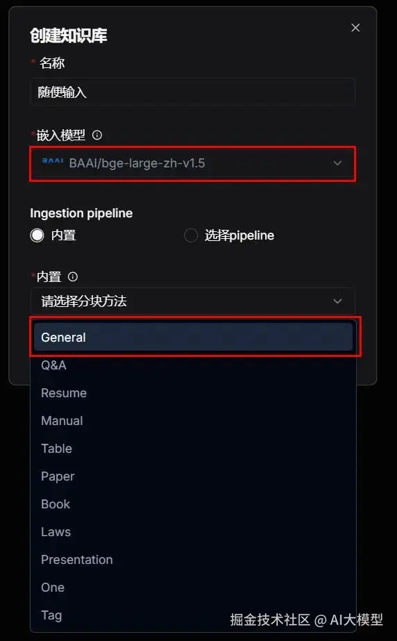 | 这里的Ingestion pipeline 是指如何给你的文档分块,选择:"内置",一般都选择General,(后续可以修改) 而"选择pipeline",就需要你自己提前搭设好智能体,根据自己的智能体给文档分块,这里属于高阶玩法,后续我探索了再告诉大家。 |